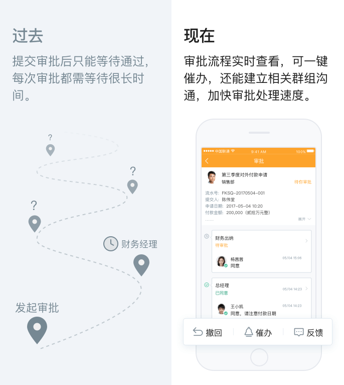 海南我房网是海南房地产O2O商务模式的开创者,其200多家门店遍布海南的18个县市。以前试用OA系统,请假、出差等审批流程都是在电脑上运行,对于经常在外面的销售人员非常不方便,通常一个审批需要等待很长的时间才能完成。 现在,员工随时都能在手机上发起审批,遇到紧急审批时可一键催办或者建立相关人员群组进行沟通,大大加快了审批处理速度。